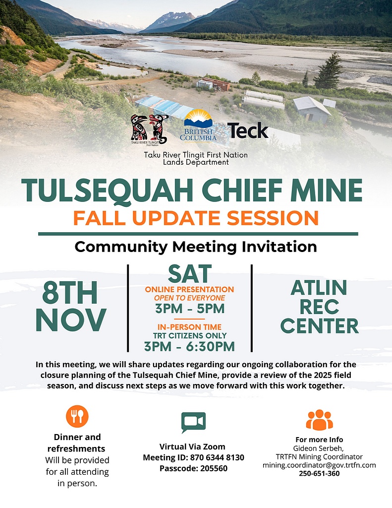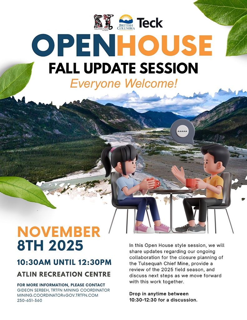 We invite you to join us on November 8th, 2025 for two important community events hosted by the Taku River Tlingit First Nation Lands Department, in partnership with Government of British Columbia and Teck Resources Limited.